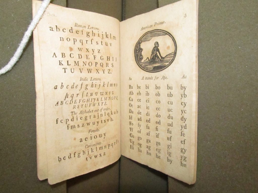 Dr. Rosenbach was an early and important collector of children’s books. This passion will be the subject of our upcoming exhibition Bescribbled, Nibbled, and Dog-Eared: Early American Children’s Books, which opens July 9. He gave most of his children’s book collection to the Free Library of Philadelphia (of which he was a trustee) in 1947 and we will be borrowing a number of these volumes for the exhibition. There are, however, some children’s books still at the Rosenbach, including a number of primers — books used to teach basic reading and spelling.