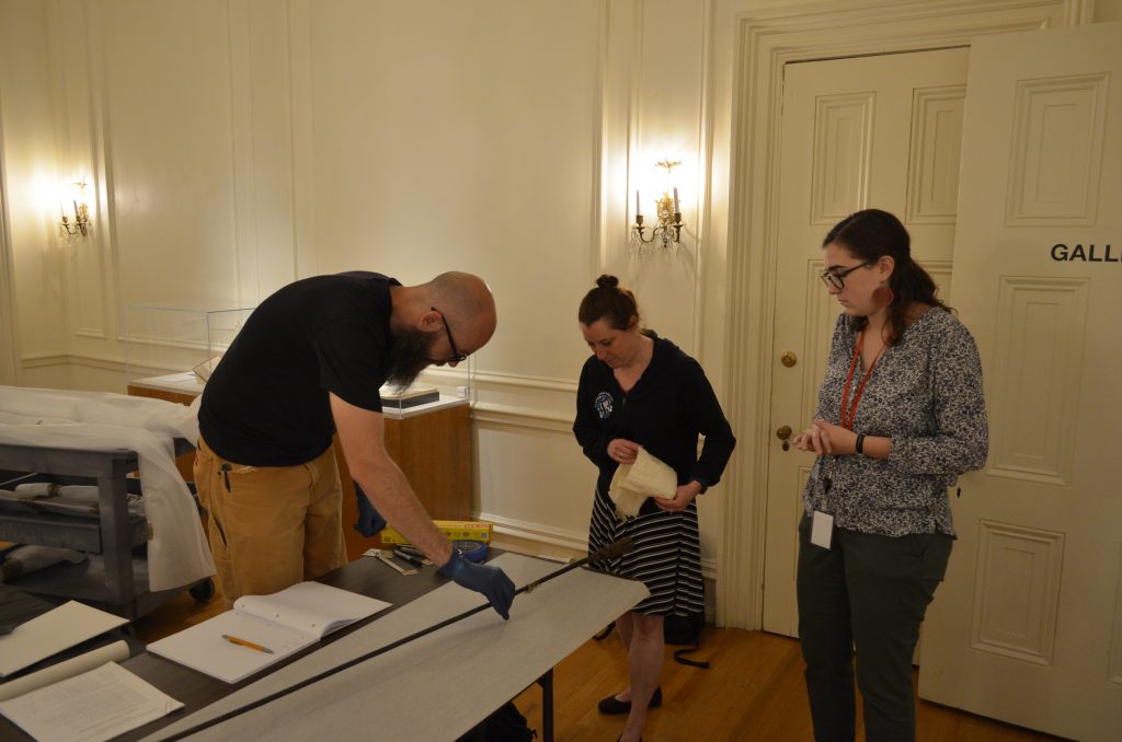 This summer, I worked with the Rosenbach’s registrar, Jobi Zink, on a ton of different projects. Having a finger in every pie is basically what registrars do: they organize loans, install exhibitions, inventory the collections, and more. On my very first day I helped deinstall the Spring Program Gallery to make way for the summer’s selection of program-related objects. Since then, I’ve inventoried the American Manuscript collection (my favorite find was a letter from Thomas Jefferson to James Madison about a sculptor for a statue of George Washington), made a soon-to-be-available collections guide for our incunabula (books printed before 1500), and assisted with securing the loans for several exhibitions. With my background, I was especially pleased to work on loans for an exhibition of medieval manuscripts digitized by BiblioPhilly, that will be opening at the Free Library’s Central Branch next spring. However, my favorite part of my internship was the day we transported both a harp and some harpoons (for Bloomsday 2019 and the upcoming American Voyager: Herman Melville at 200 exhibit, respectively). It was pretty great pretending to poke people with 19th century whaling implements! Overall, I’ve had a ton of fun this summer, gotten to handle some really interesting rare books, and reaffirmed just how much I want to work in special collections when I grow up. Thanks, Rosenstaff!”