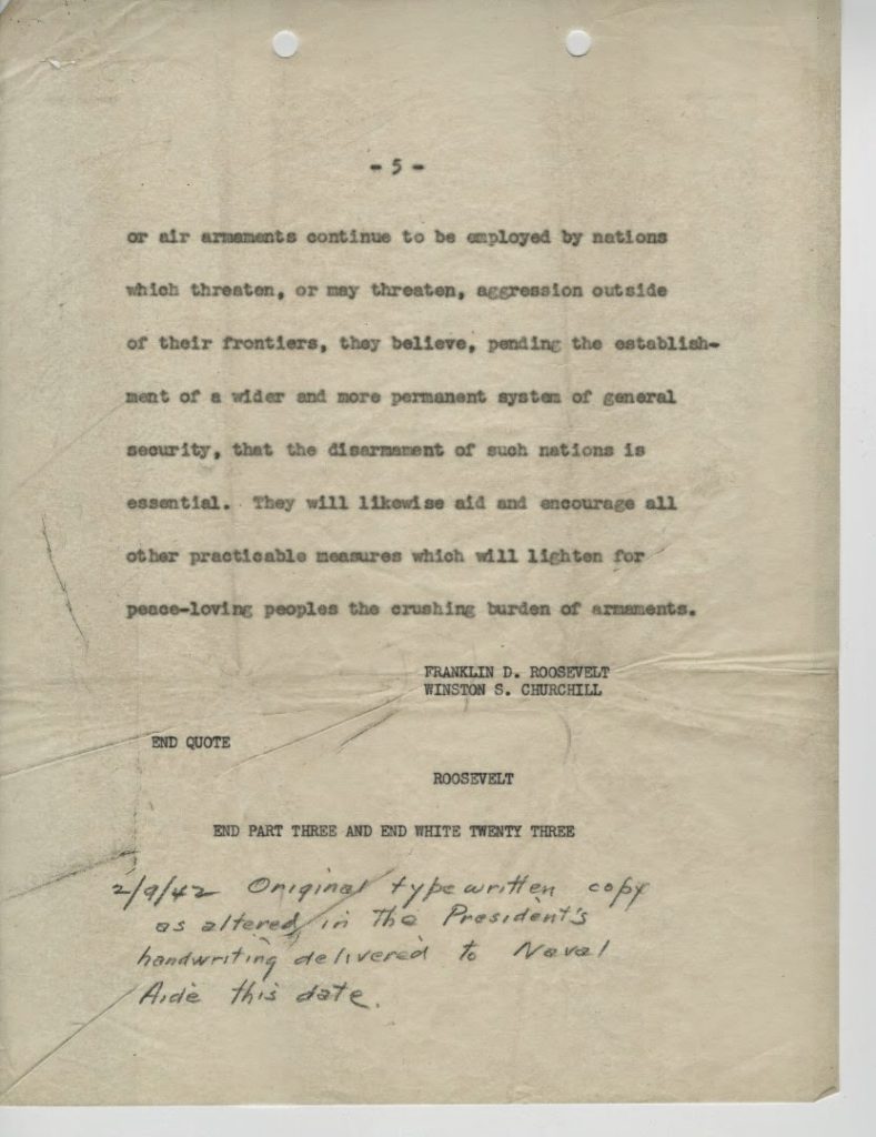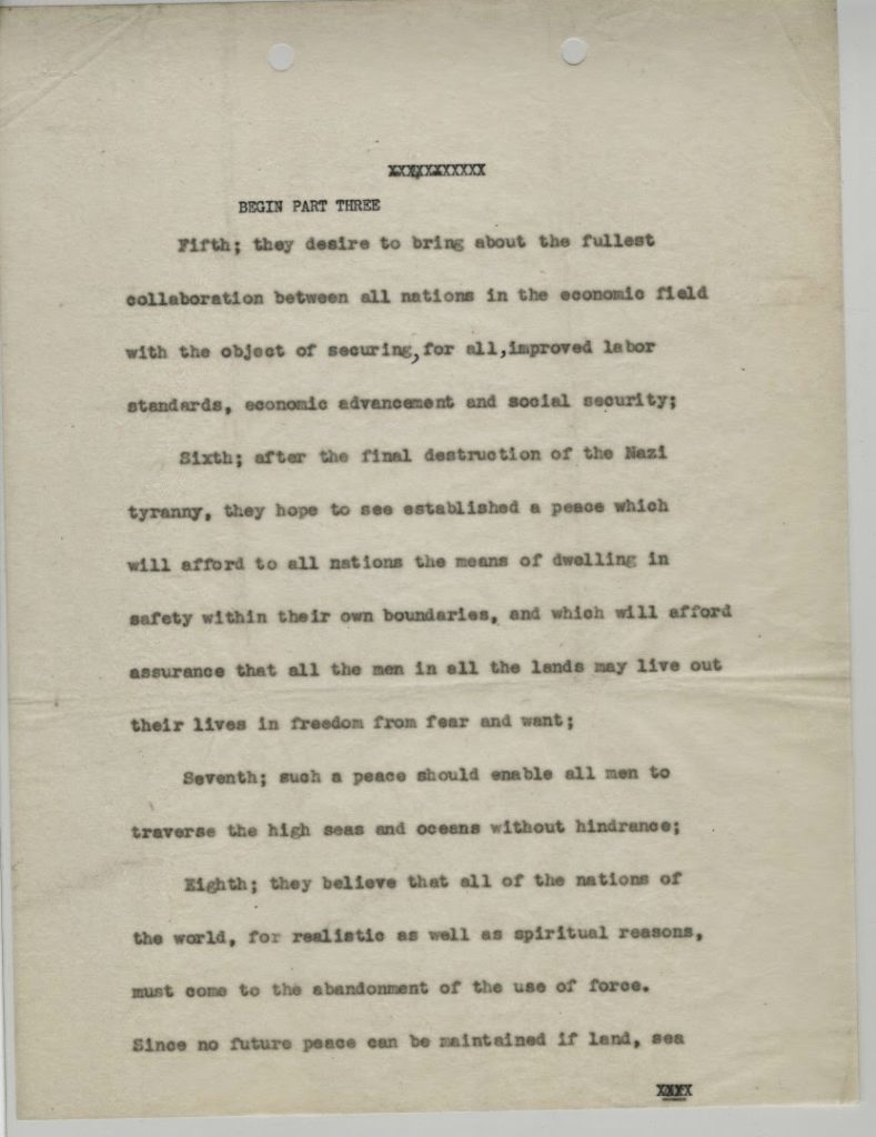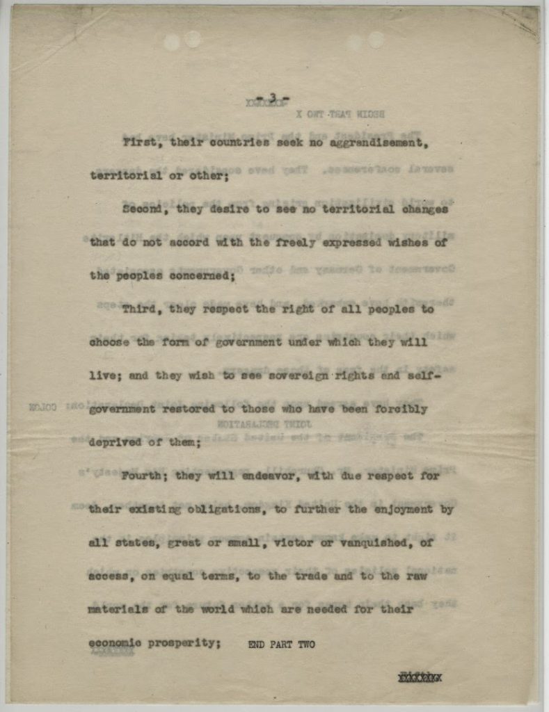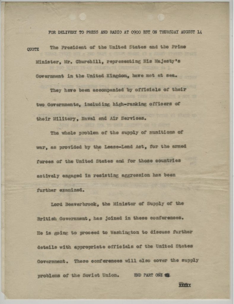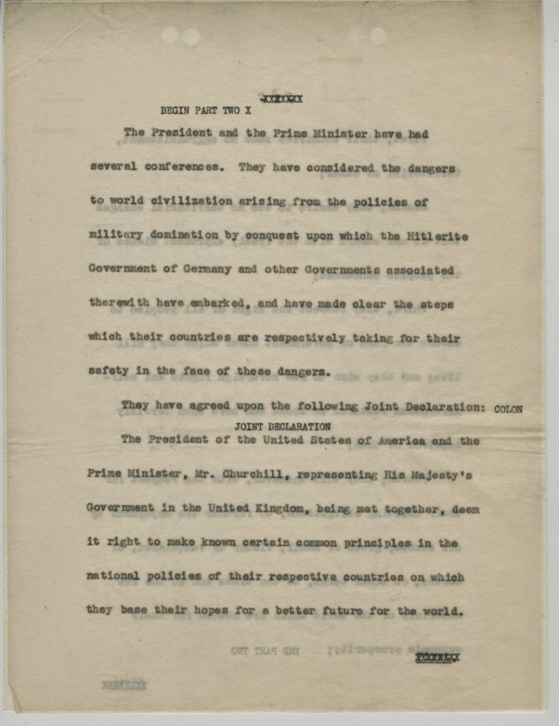 The Atlantic Charter was the result of the Atlantic Conference, held August 9-10, 1941. The United States had not yet declared war but was supplying the Allies through Lend-Lease. Churchill and Roosevelt met on the U.S.S. Augusta, harbored in Newfoundland, to discuss war aims and post-war goals. The Atlantic Charter was an affirmation of the two countries’ shared Wilsonian vision for a postwar world, including that they would “seek no aggrandisement, territorial or other,” were committed to “respect[ing] the right of all peoples to choose the form of Government under which they will live,” and hoped for a peace “which will afford to all nations the means of dwelling in safety within