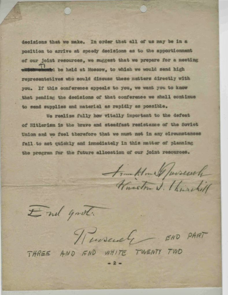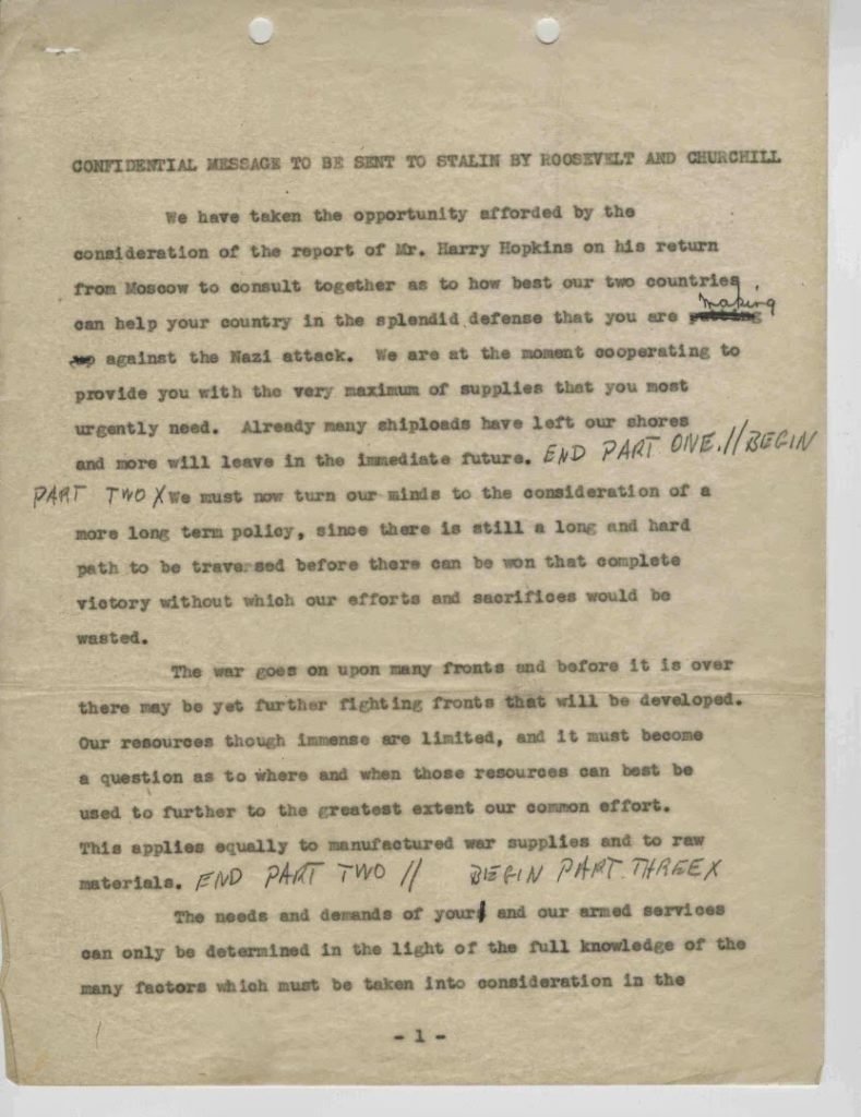 Our documents also include a carbon of a message sent from FDR and Churchill to Stalin regarding supplies and planning. There are corrections in Roosevelt’s hand and he signed both men’s names to the message.