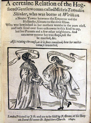 So what are you going to be for Halloween this year? If you haven’t picked yet, perhaps you could go as Mistris Tannakin Skinker, the hog-faced woman. According to a 1640 pamphlet in our collection, Mistris Skinker was born in 1618 with the snout of a pig after her mother turned away a beggar woman who was also a witch. The woman left muttering, “As the mother is hoggish, so swinish shall be the Child shee goeth withall.” Mistris Skinker, lovely apart from her deformity, eats from a silver trough and speaks only in grunts, although she can make her desires known in writing.
