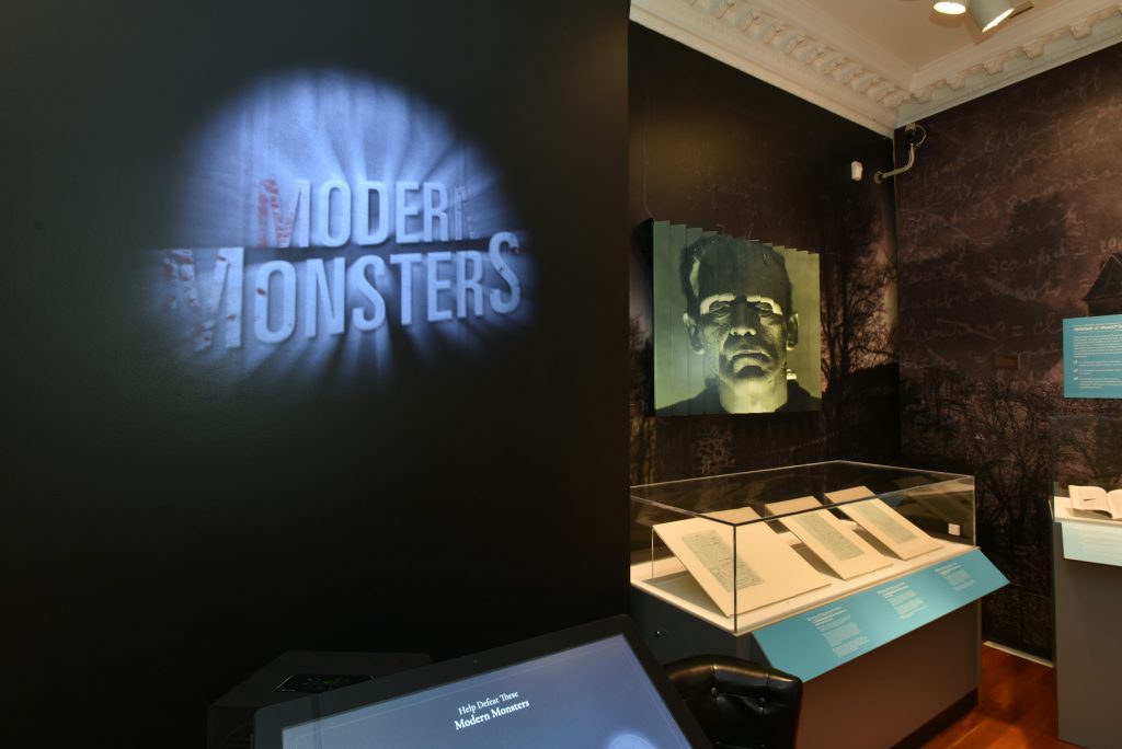 Frankenstein & Dracula exhibition gallery, picturing pages of Mary Shelley’s manuscript under image of Frankenstein’s monster.