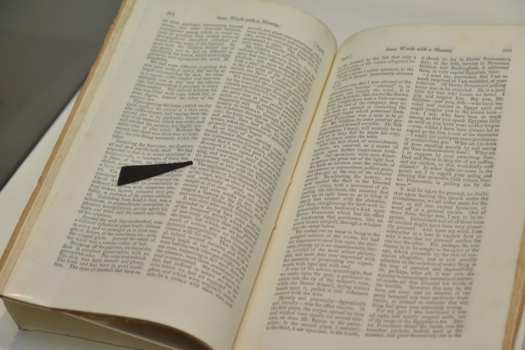 Read one of Poe’s humor tales in honor of Edgar Allan Poe’s birthday today (January 19).  And you can see the first publication of Poe’s “Some Words with a Mummy”, in the journal American Review, in our Frankenstein & Dracula exhibition, along with the manuscript page of Shelley’s Frankenstein that mentions the creature’s mummy-like appearance.