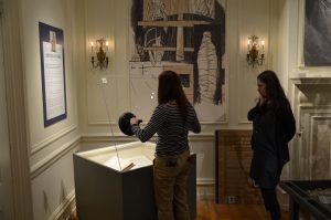This means moving objects from place to place but packing objects so they can be safely moved or stored. Jobi also installs objects in our exhibitions and builds supports or mounts so that they can be displayed to best advantage. Here Jobi has just installed some objects in a case for our exhibition American Voyager: Herman Melville at 200, and is using suction cups on the plexiglass to safely and without leaving fingerprints, close the case.
