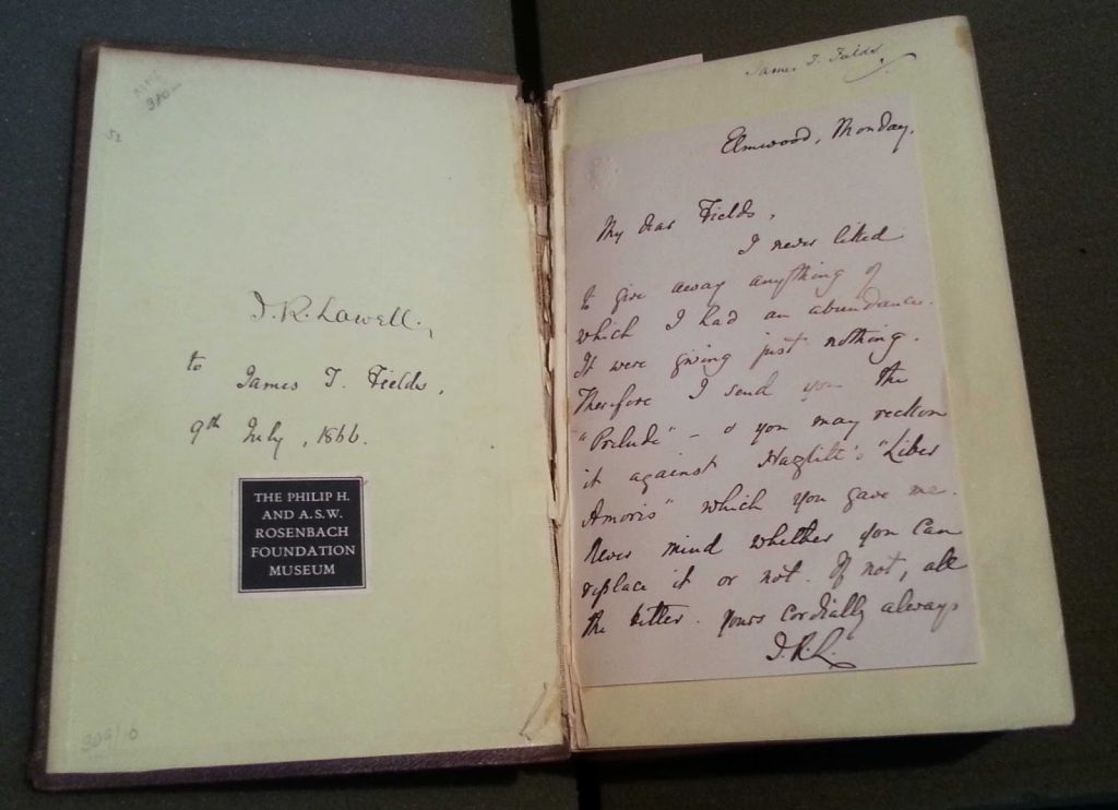 This copy was ultimately given by Lowell to the publisher and poet James T. Fields in 1866, as evidenced by another inscription on the paste down. Lowell’s esteem for the book is evident in the letter tipped into the front, which explains that “I never liked to give away anything of which I had an abundance. It were giving just nothing. Therefore I send you the “prelude”–and you may reckon it against Hazlitt’s “Liber Amoris” which you gave me.”