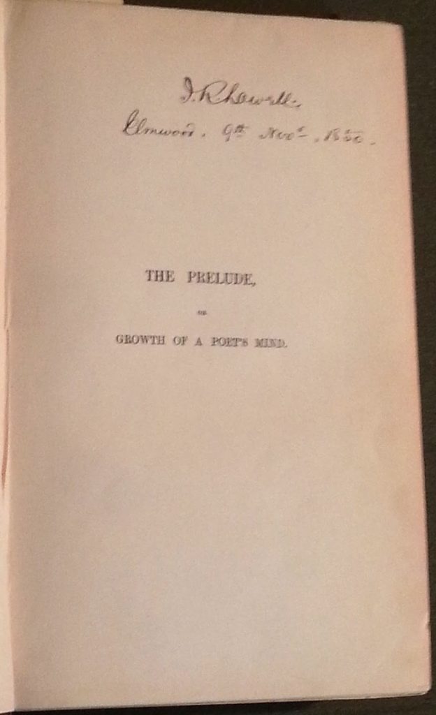 We also have a copy of Wordsworth’s posthumously-published book The Prelude that was owned by the New England poet and author James Russell Lowell. Lowell signed and dated the half title in 1850.