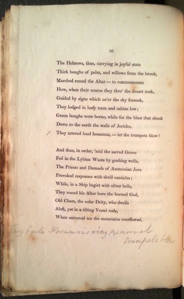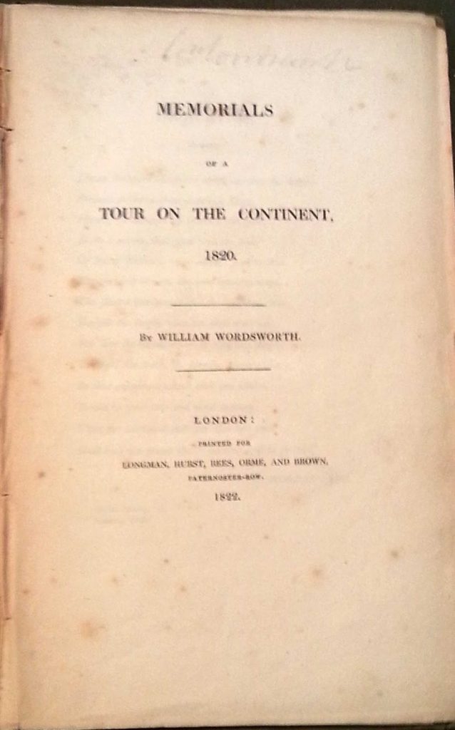 One such piece is Wordsworth’s copy of Memorials of a Tour of the Continent 1820, published in 1822. This book of poetry was inspired by his 1820 European tour, which he had undertaken with his sister Dorothy, his wife Mary, and some of Mary’s relations. Wordsworth scholars like to point out that this tour was a re-run in reverse of a 1790 walking tour that Wordsworth had done with his friend Robert Jones. They also note that although we often think of Wordsworth in terms of the Lake District and domesticity, mobility and travel were also key aspects of his life and personality.