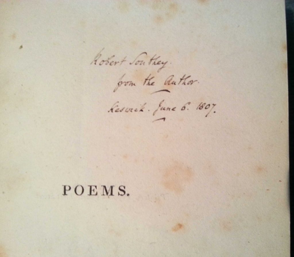 Wordsworth. Our copy of his 1807 Poems, in Two Volumes (which includes his famous “I wandered lonely as a cloud“) is inscribed on the half-title from Wordsworth to his friend and fellow poet Robert Southey.